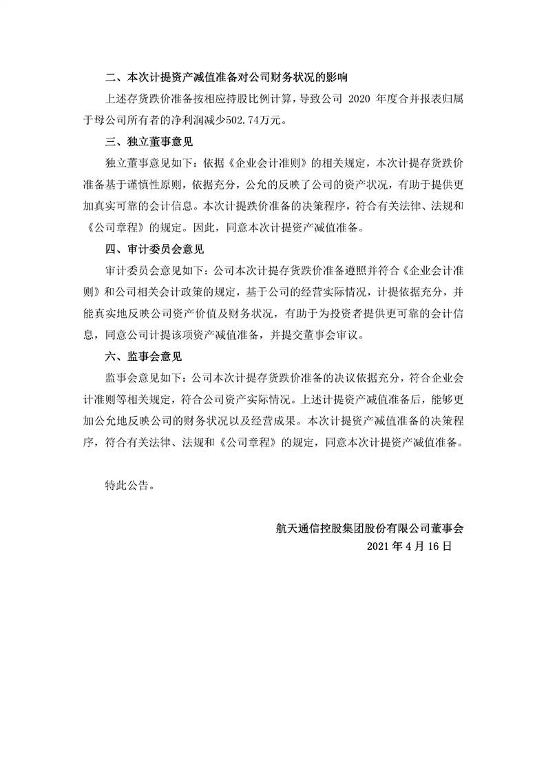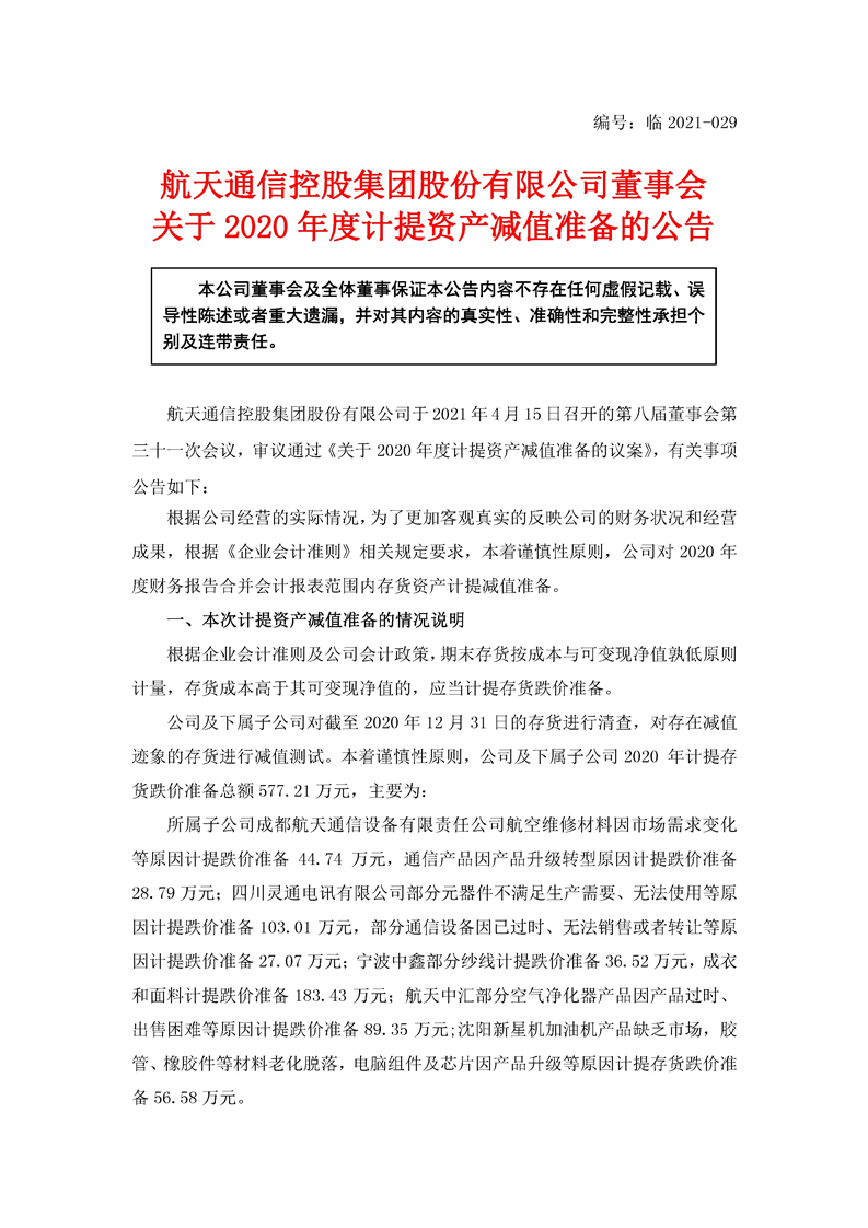 航天通信控股集團股份有限公司關于2020年度計提資產(chǎn)減值準備的公告