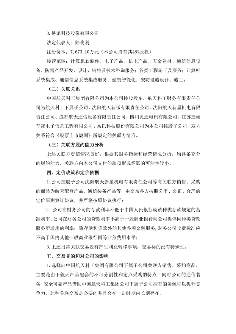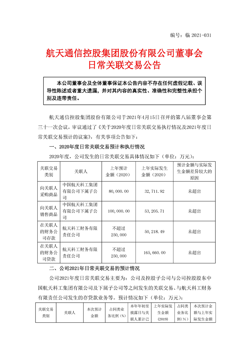 航天通信控股集團股份有限公司日常關聯交易公告