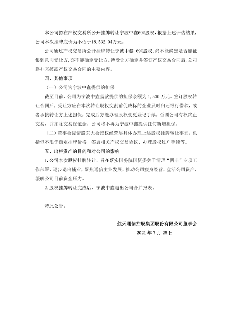 航天通信控股集團股份有限公司關(guān)于掛牌轉(zhuǎn)讓寧波中鑫毛紡集團有限公司69%股權(quán)的公告